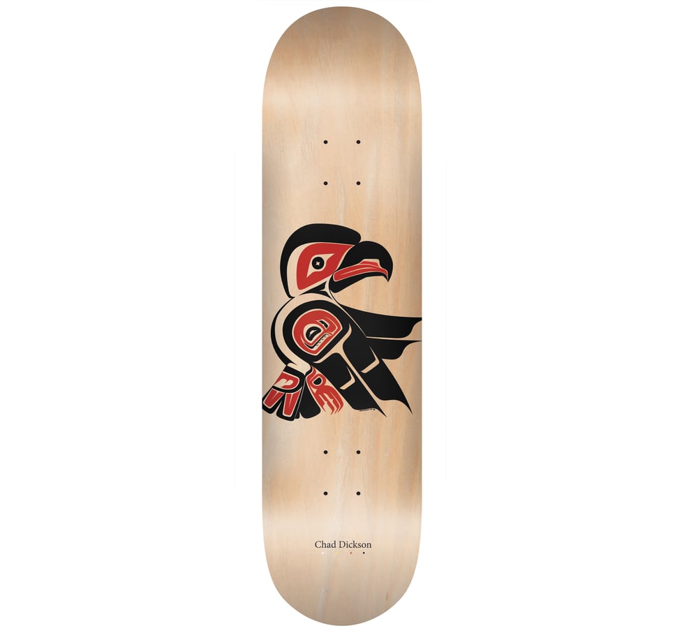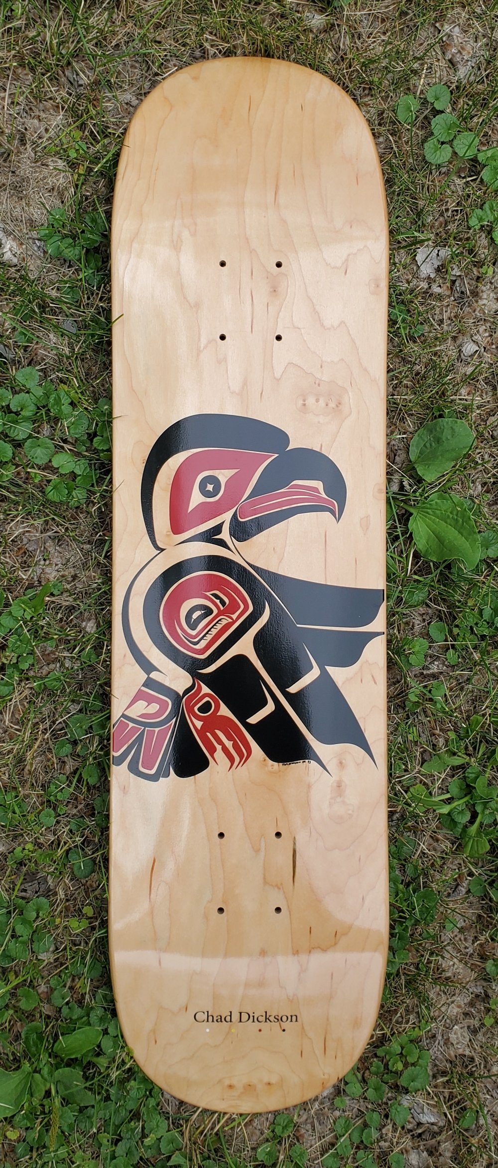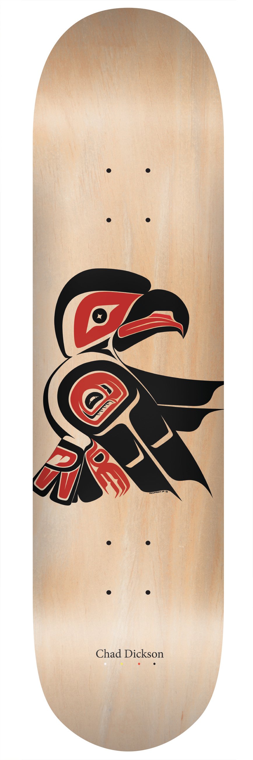 For the next pro graphic, Colonialism introduces their latest team rider, Chad Dickson. This pro graphic was created by Tom Dickson Jr., who is Chad’s uncle. Tom Dickson Jr. comes from a long line of Tlingit artists. Tlingit means “People of the Tides.” Chad’s home community is Teslin, Yukon. The Tlingit language is said to be distantly related to Eyak, which is now considered an extinct language from Alaska. His language is, “spoken in the Yukon communities of Teslin and Carcross, in the Atlin area of British Columbia, and coastal settlements stretching along the Alaskan panhandle from Yakutat to Ketchikan. Given the geographic range of the language, there is relatively little dialect diversity, and all speakers can generally understand each other” (Tlingit Translation). Chad’s language and cultural traditions are passed down from Elders within his community through harvesting camps, ceremonies and cultural events.